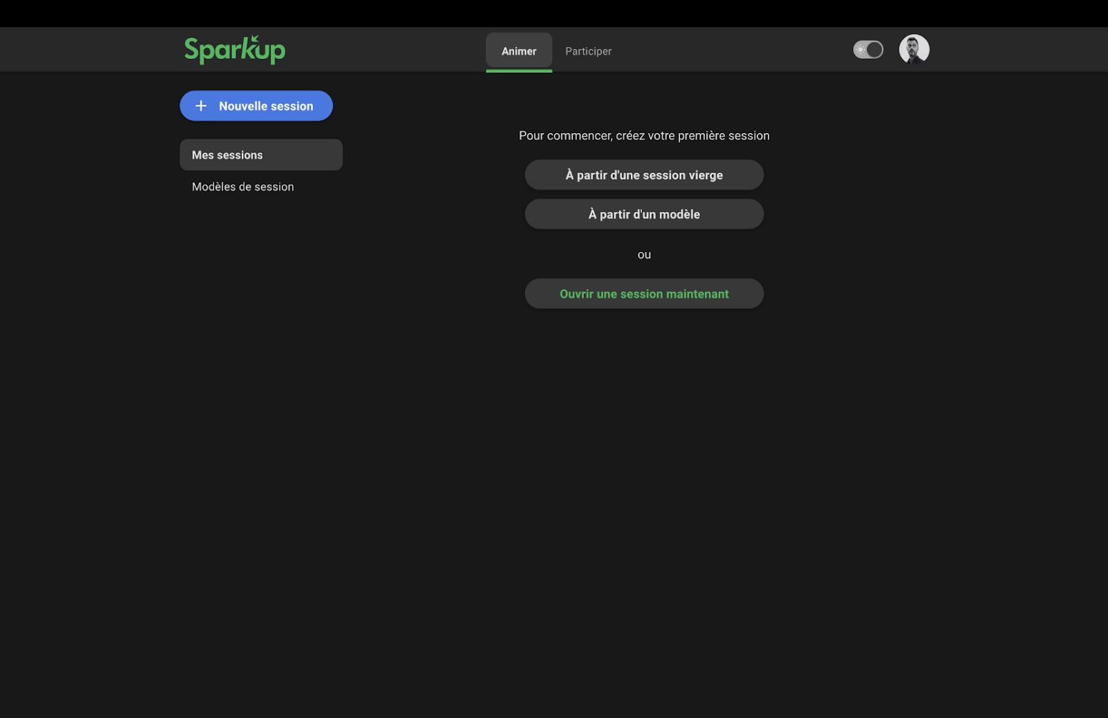 Si l'adresse e-mail utilisée est associée à un profil administrateur, vous serez automatiquement redirigé(e) vers l’interface d’administration de Sparkup, où vous pourrez créer et gérer vos sessions.