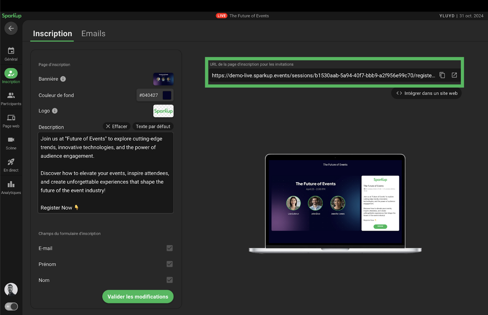 - URL de la page d'inscription pour les invitations : Un lien unique est généré pour faciliter la diffusion de la page d'inscription par email, sur les réseaux sociaux etc.