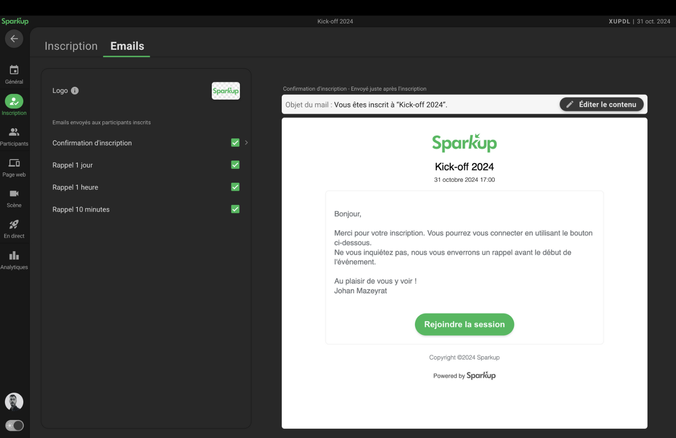 - Emails Automatisés : Personnalisez les emails envoyés automatiquement aux participants pour la confirmation et les rappels. Par défaut Sparkup envoie 4 emails (une confirmation et 3 rappels).