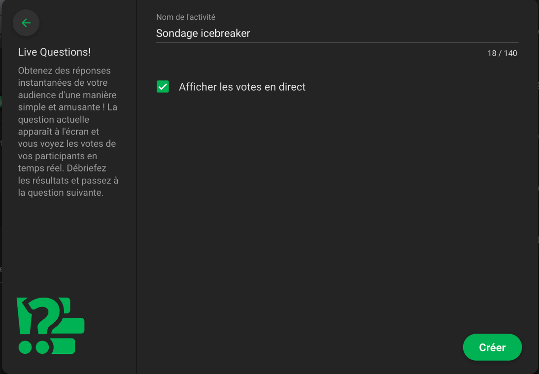 Suivez ces étapes pour créer et gérer une activité de sondage en direct (Live Questions!).