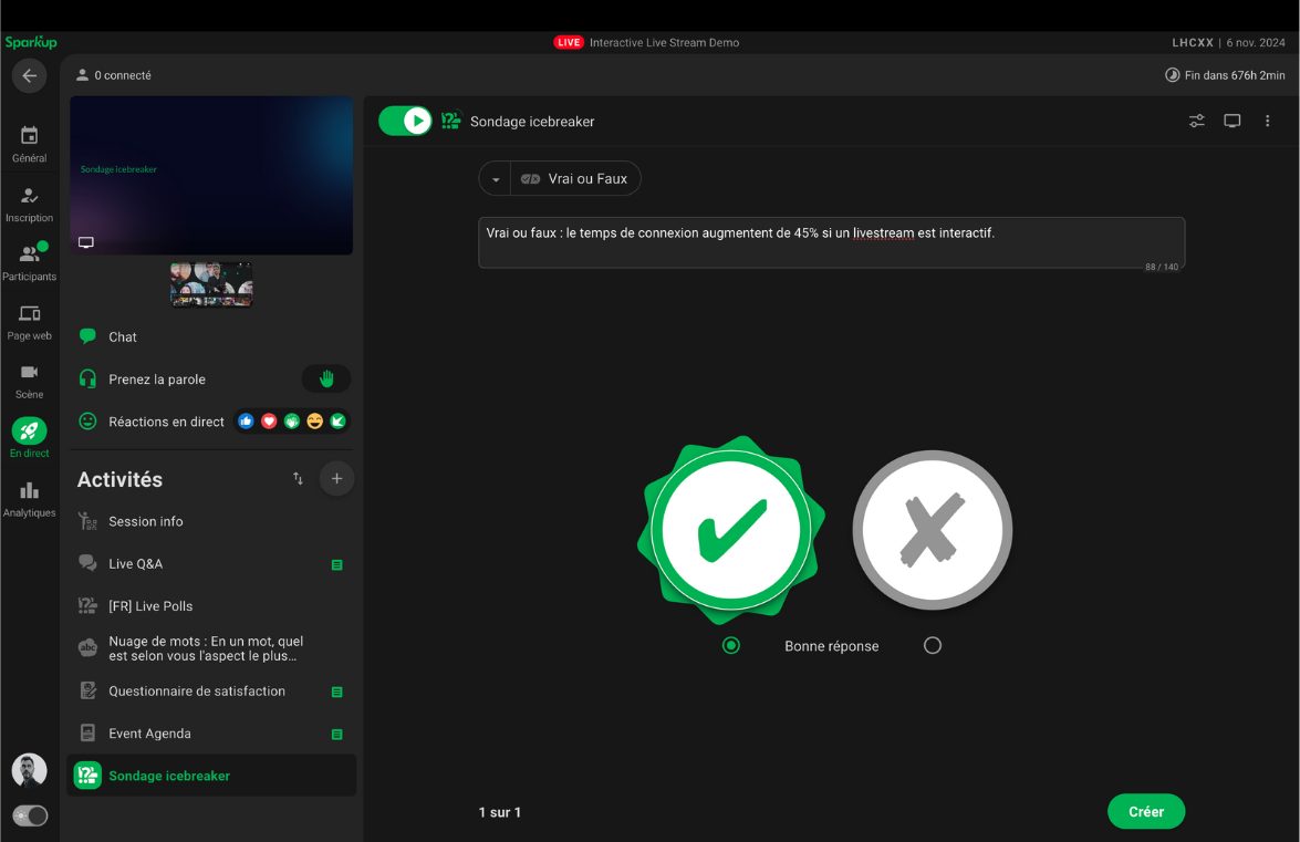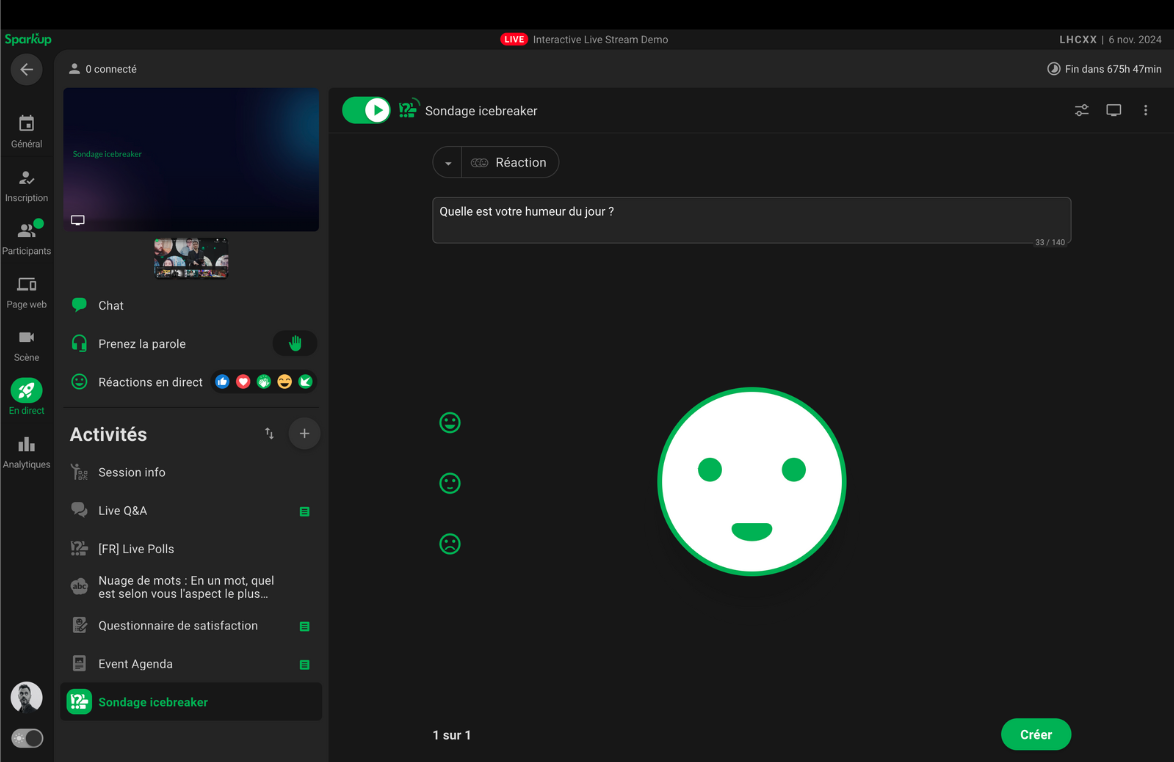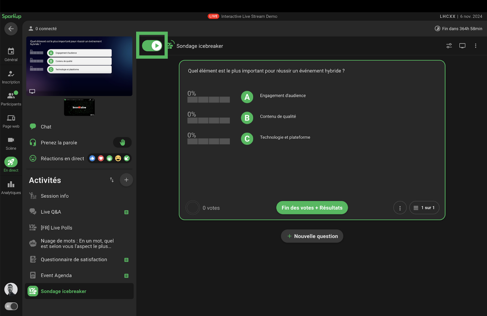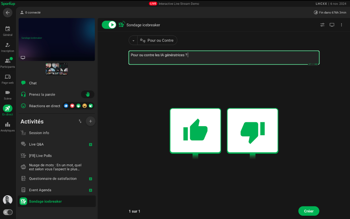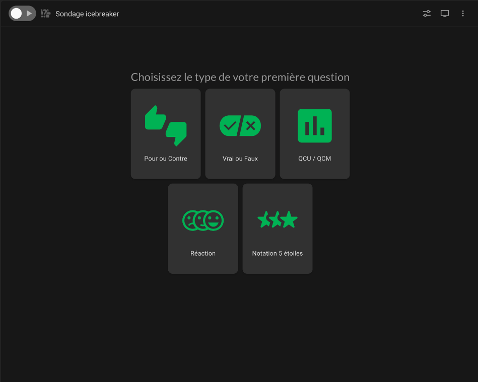 En haut à gauche, l’interrupteur permet d’activer ou de désactiver votre sondage pour les participants.