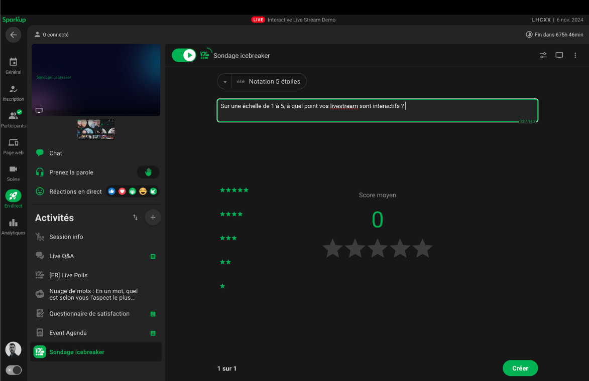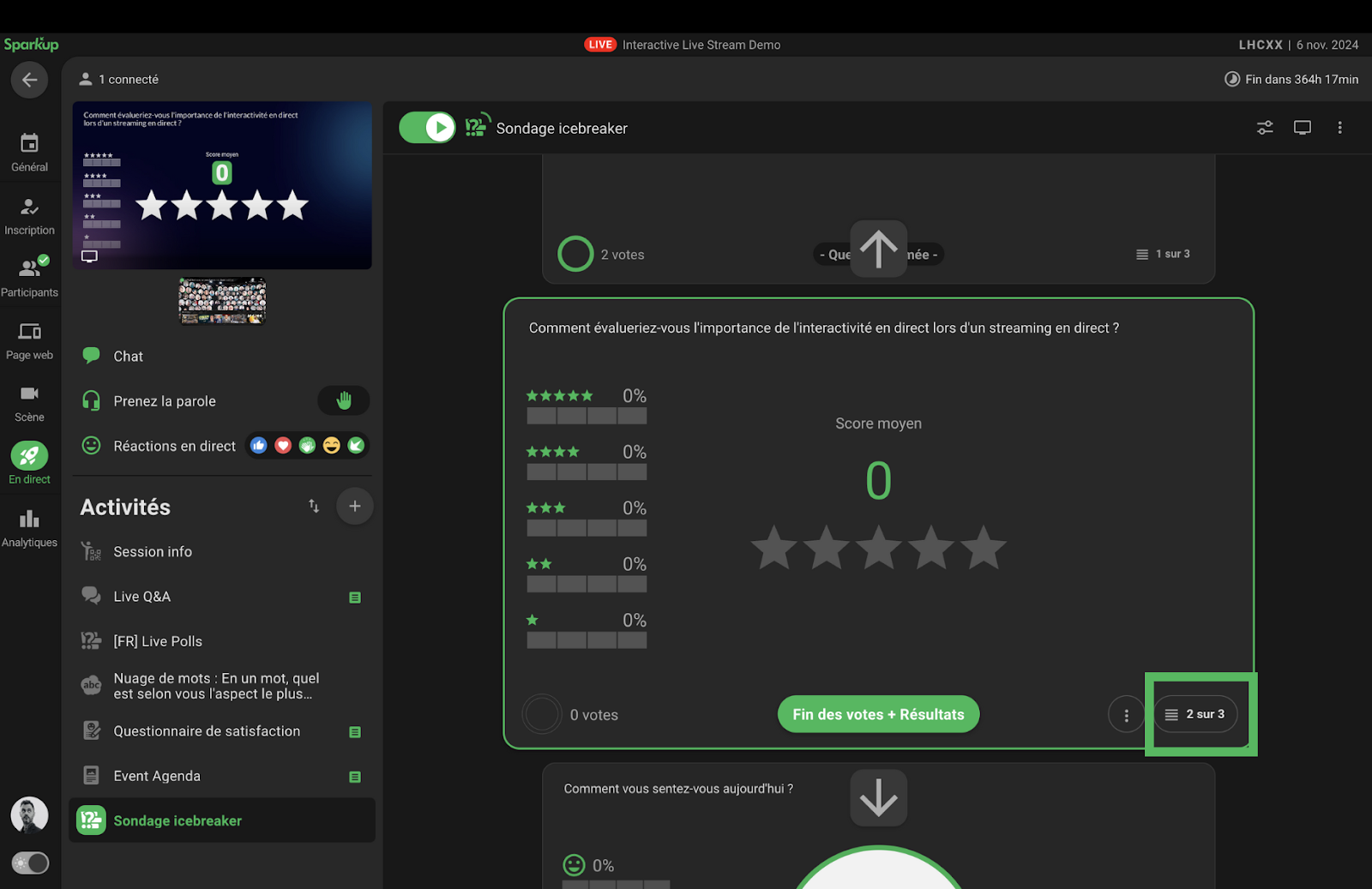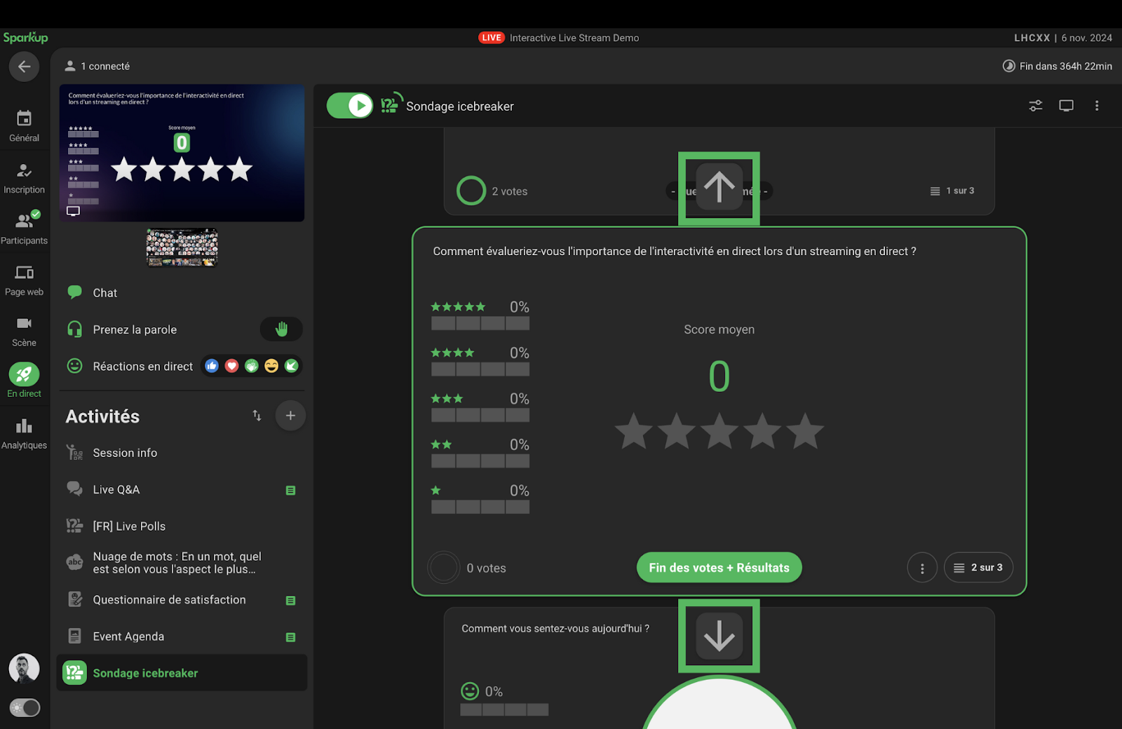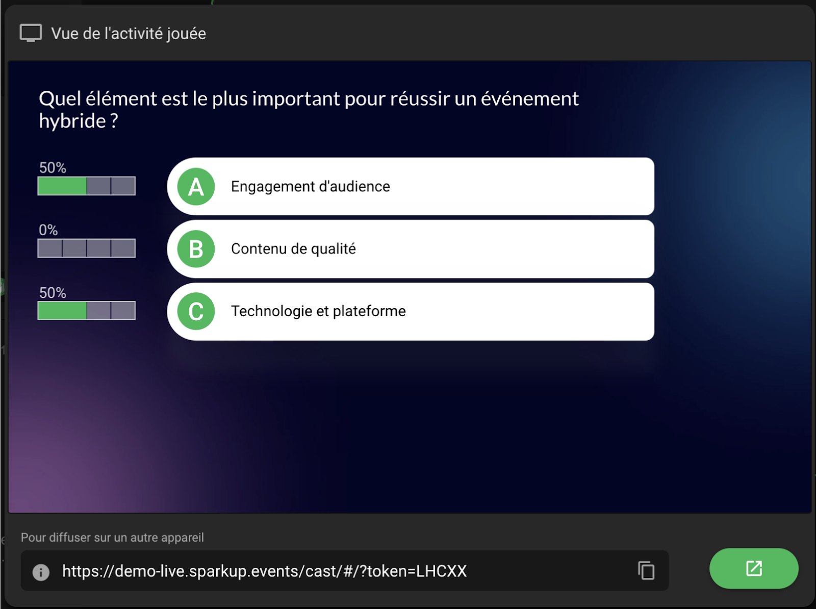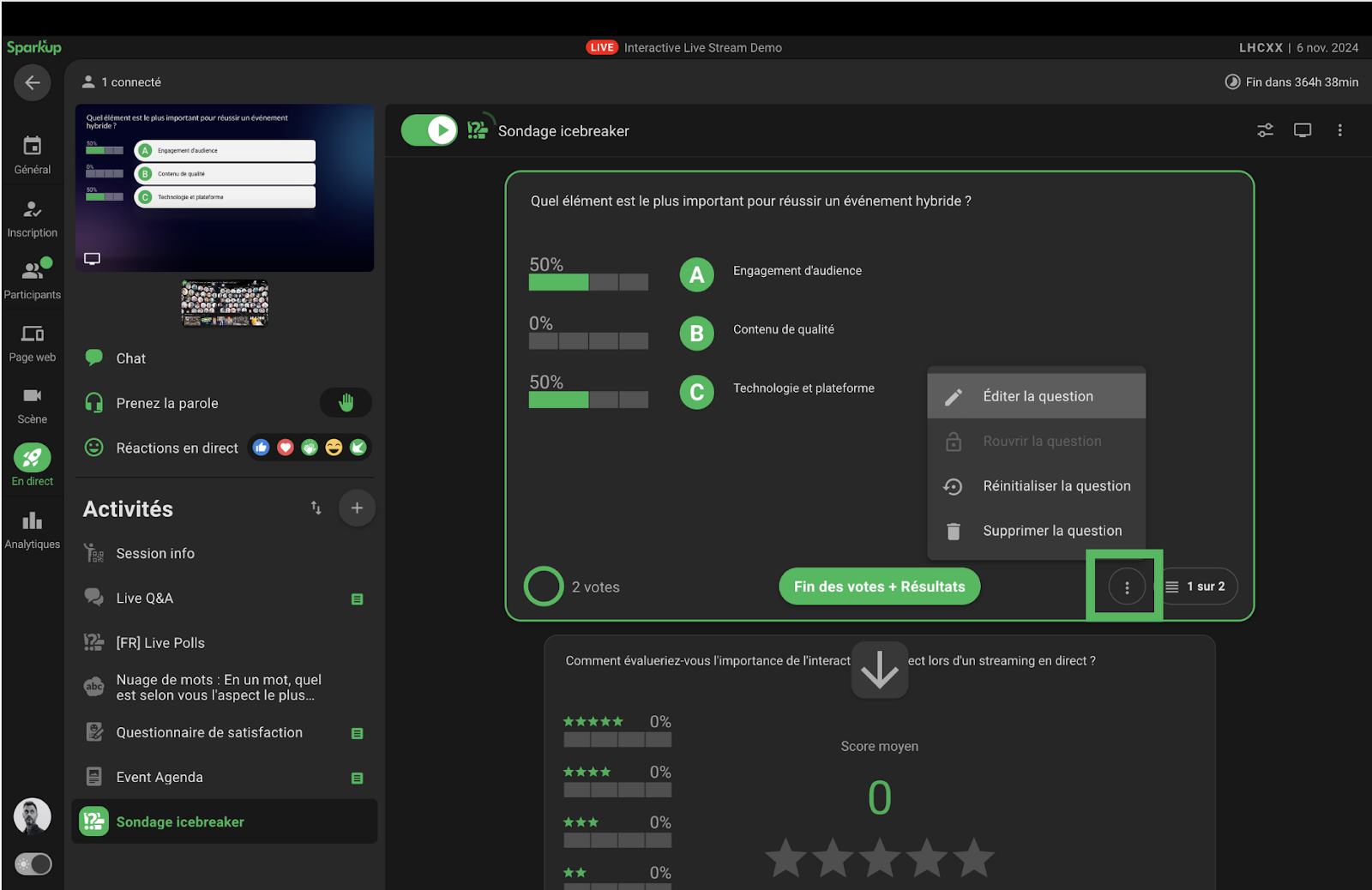 L’interface de sondage en direct permet d’activer les votes et de voir les résultats des participants en temps réel.