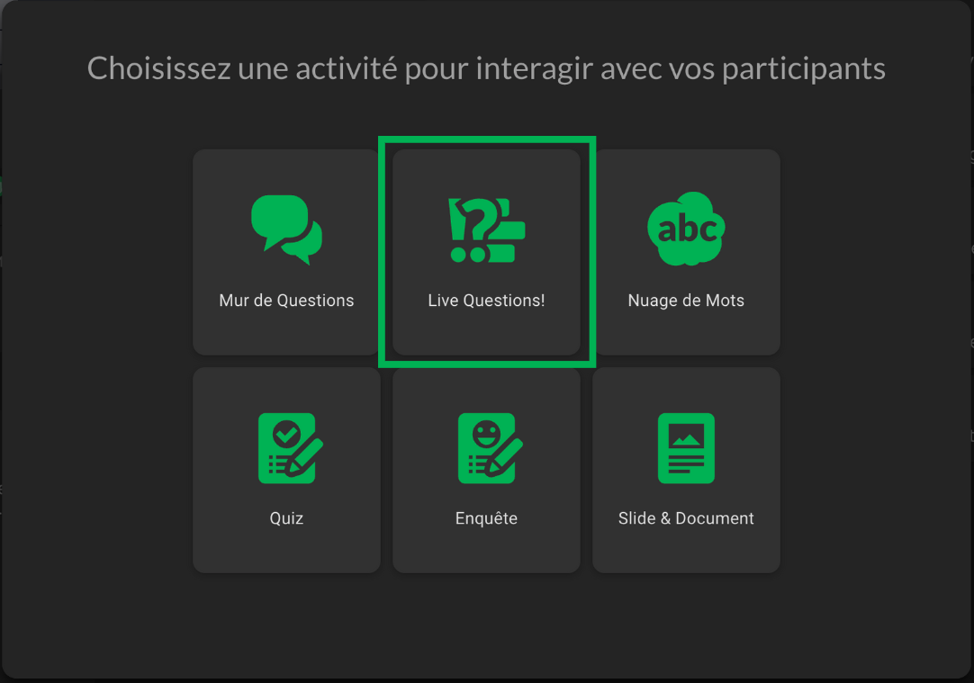 - Choisissez l’activité “Live Questions!”