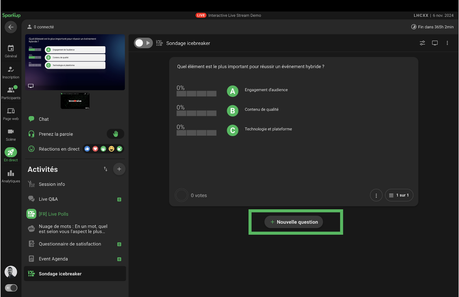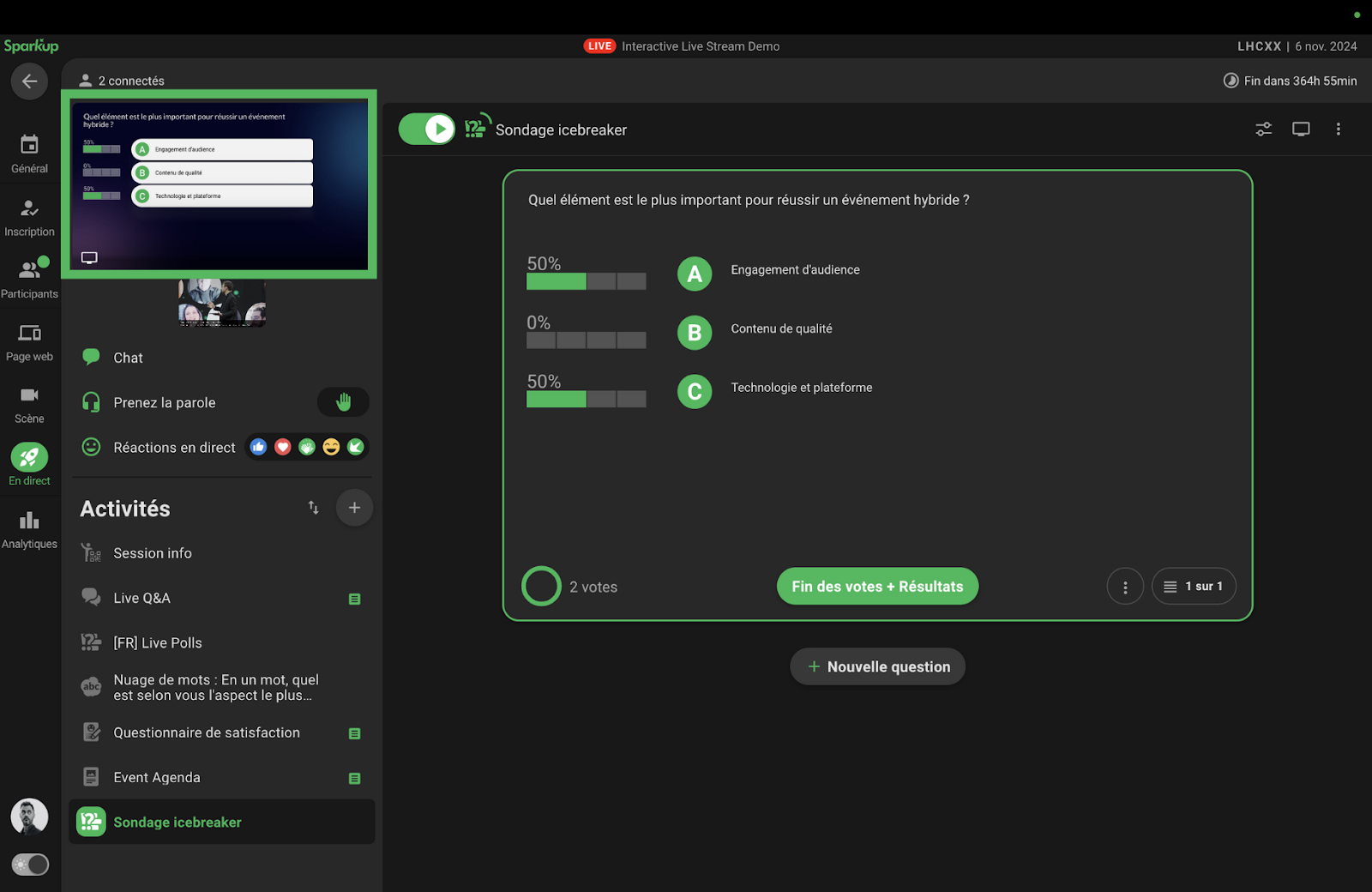 Avec les sondages en direct (Live Questions!), engagez votre audience de manière rapide en recueillant instantanément leurs opinions ! Les sondages permettent de capturer les tendances des participants sous forme de graphiques animés et de pourcentages, facilitant ainsi une interaction dynamique. Les résultats s'affichent en temps réel, offrant au présentateur une occasion idéale de rebondir sur les réponses pour enrichir l’échange.