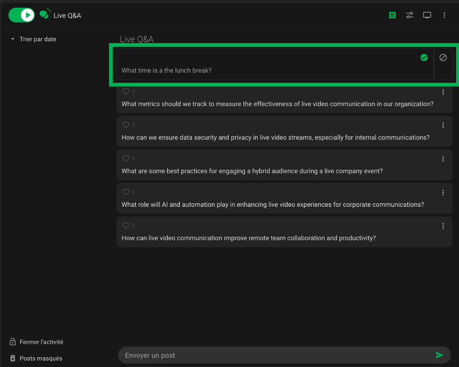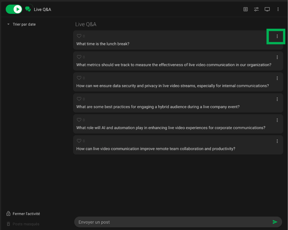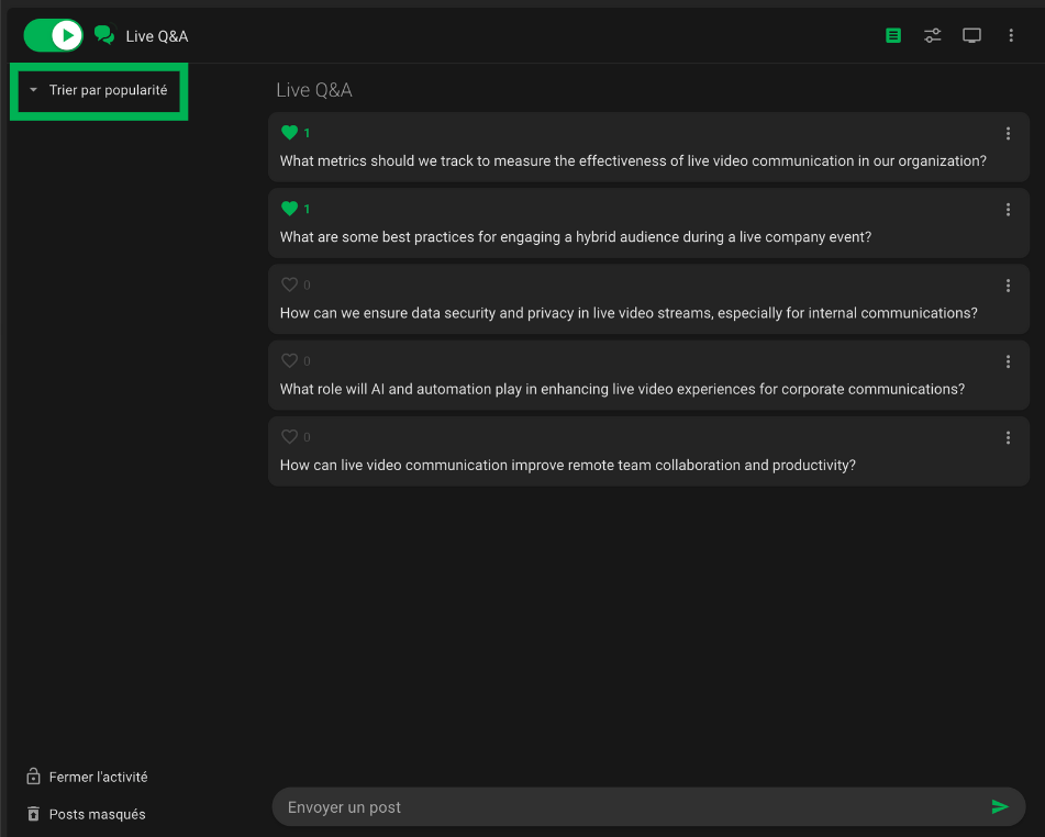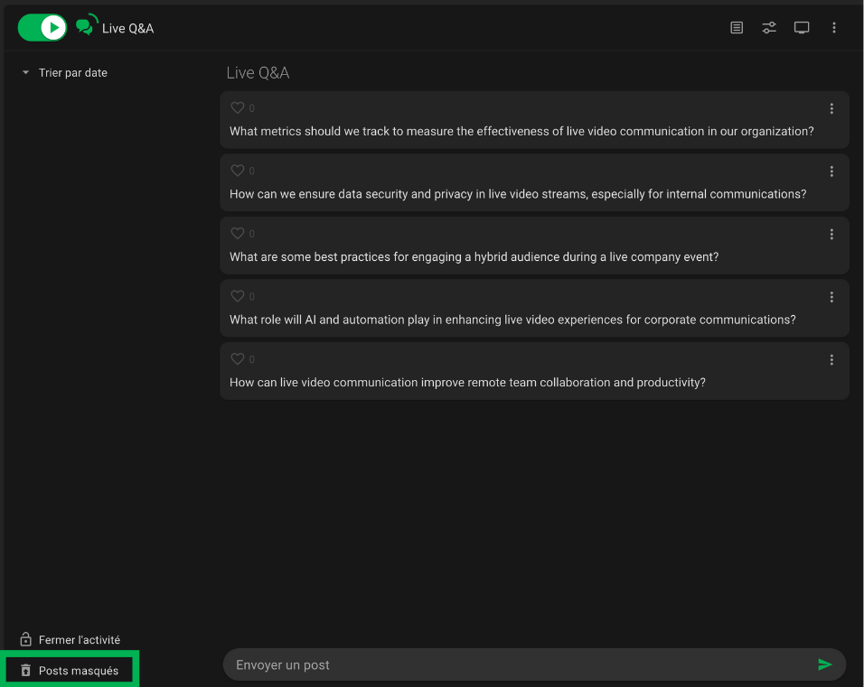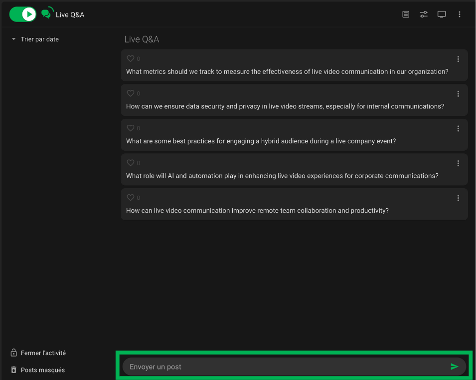 En haut à gauche, l’interrupteur permet d’activer ou de désactiver le Mur de Questions. Lorsqu'il est activé, les participants peuvent commencer à poser leurs questions. Toutes les questions envoyées par les participants s’afficheront au centre. Si l'option d'anonymat est activée, toutes les questions apparaîtront sans les noms des participants.
