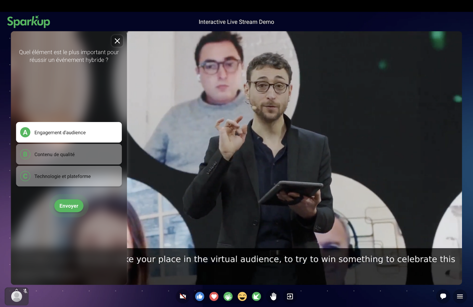 Lorsque l'interrupteur de l'activité est activé en vert, la première question de votre questionnaire apparaît sur l'interface des participants et ces derniers peuvent commencer à voter. Si les participants sont en présentiels, la question apparaît sur leur téléphone. S'ils sont connectés à distance pour suivre le live, la question apparaît sur la vidéo comme sur l'image ci-dessous.